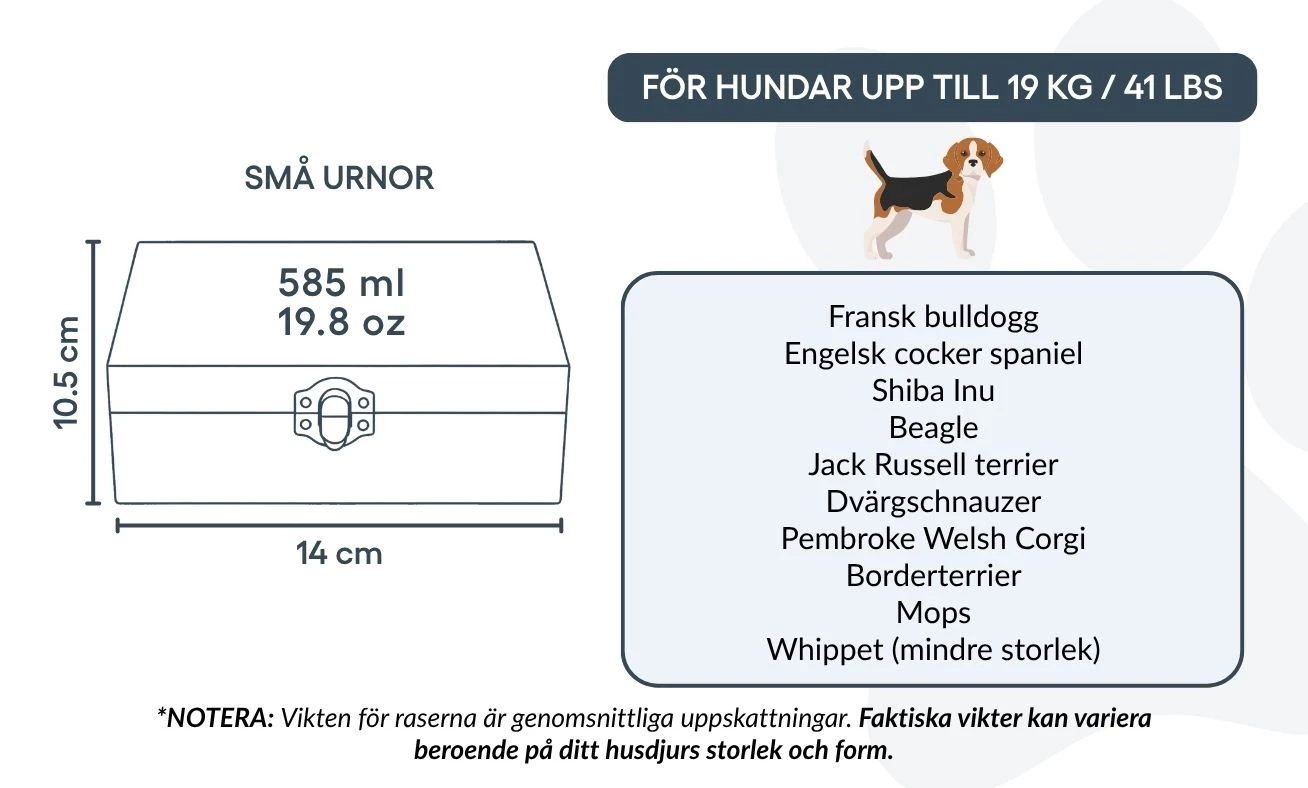 Minihundurna med graverat foto, namn och datum. En personlig minnesurna utformad för att bevara askan och hedra din hund med varaktig omsorg.