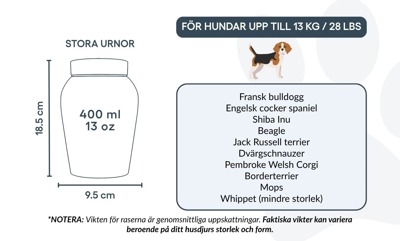 Skapa ett varaktigt minne av din älskade hund med denna Personliga Hundurna med Namn, Datum och Särskild Hyllning på Locket, omtänksamt utformad för att hedra minnet av din trogna vän med värdighet. Med ett hjärtligt budskap på locket och möjlighet att anpassa med namn och datum blir denna kremeringsurna ett djupt personligt minne av din fyrbenta följeslagare.