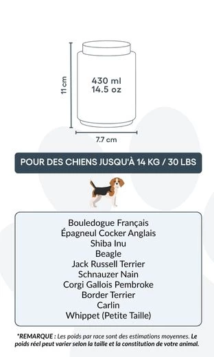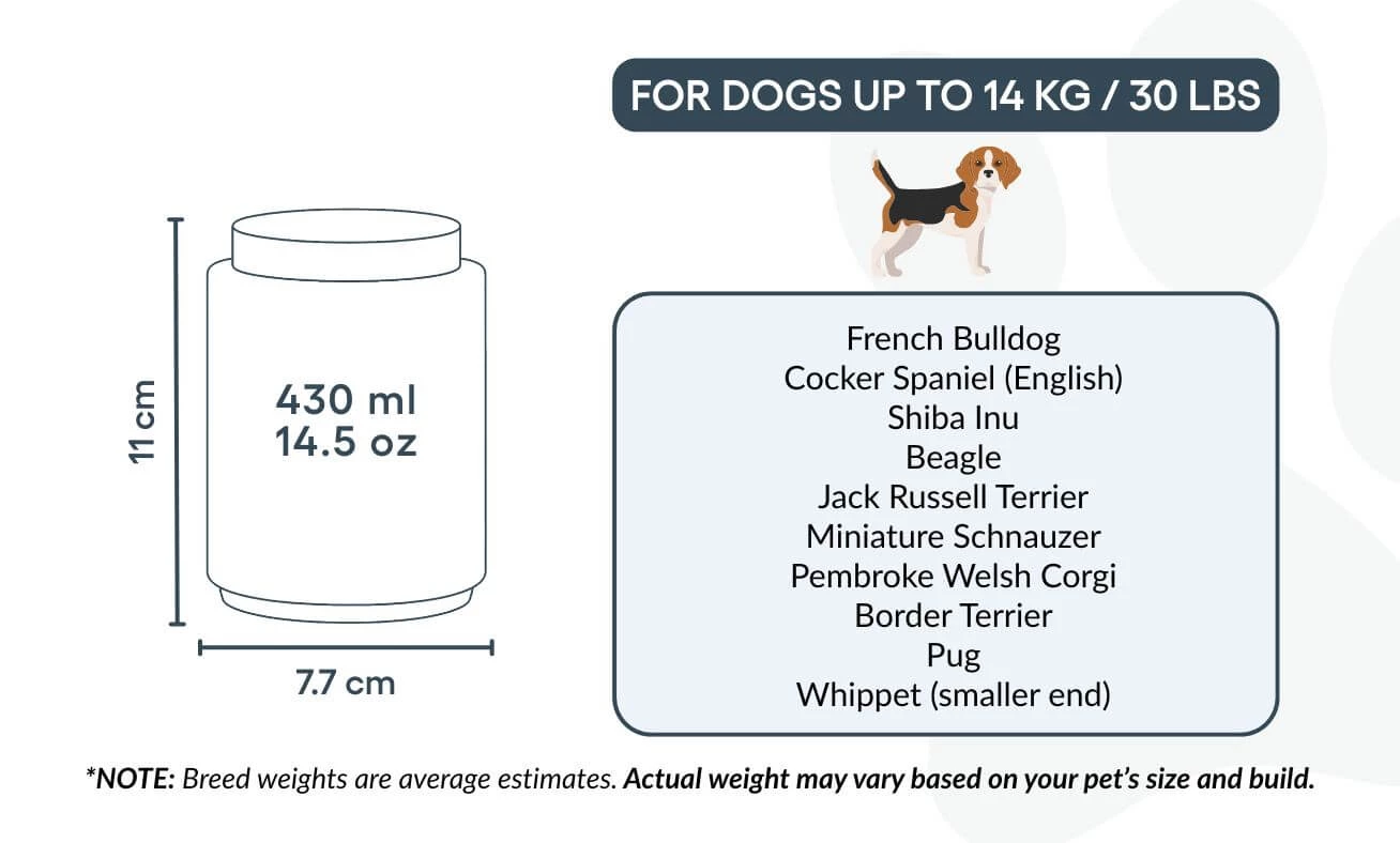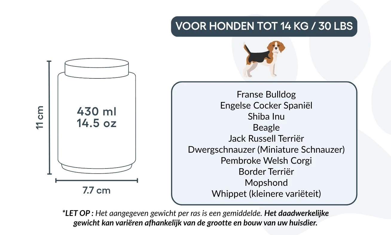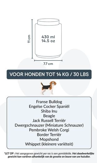 7,7 cm (B) × 11 cm (H) × 7,7 cm (L) | 430 ml / 14,5 oz | För hundar upp till 14 kg / 30 lbs