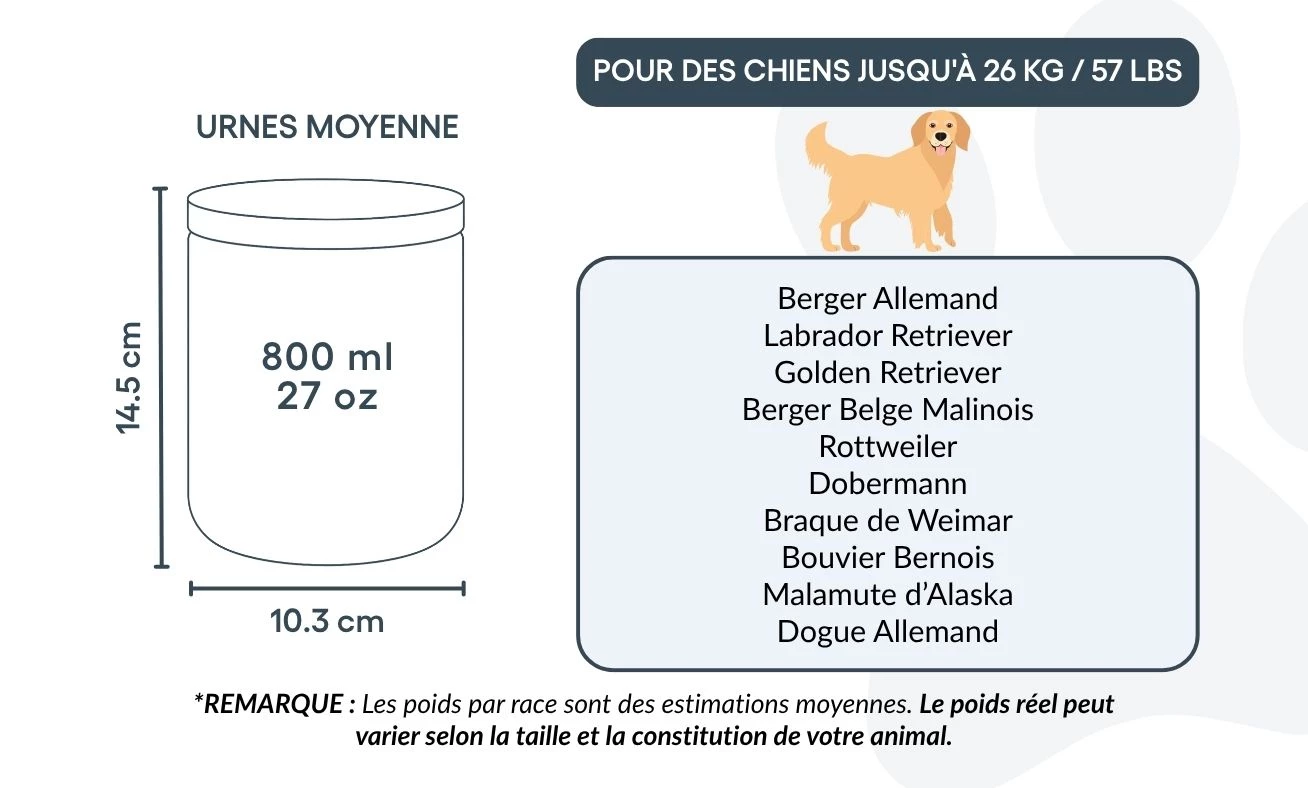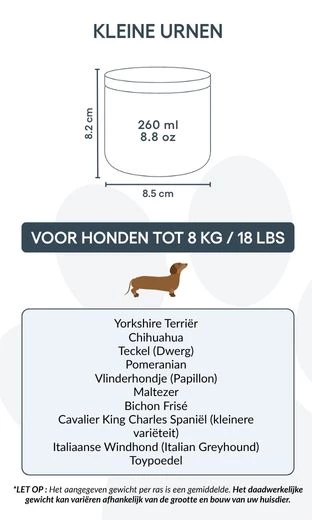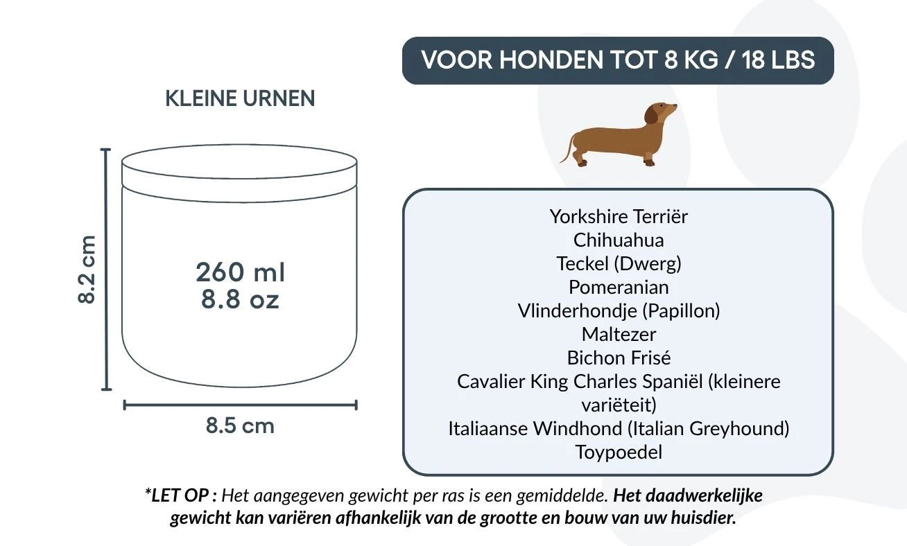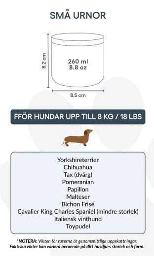 Finns i två praktiska storlekar för små och medelstora hundar och erbjuder ett värdigt och personligt sätt att ta farväl. En omtänksam lösning för husdjurskremering – och ett varaktigt minne för varje hundägare.