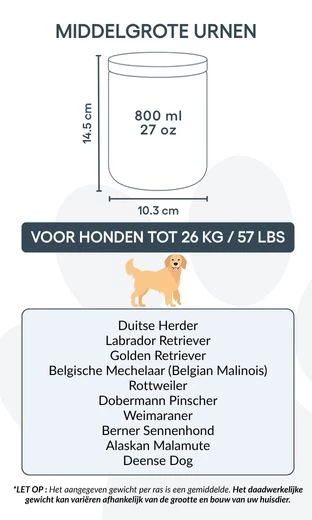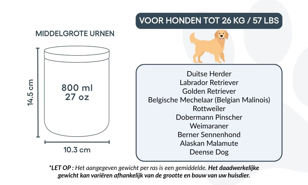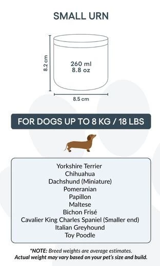 Perfekt för små till medelstora hundar, finns denna kremeringsurna i två storlekar för husdjur upp till 26 kg. Oavsett om den placeras på en hylla eller i ett stilla minnesutrymme, fungerar den som en enkel och hjärtlig påminnelse om bandet ni delade.