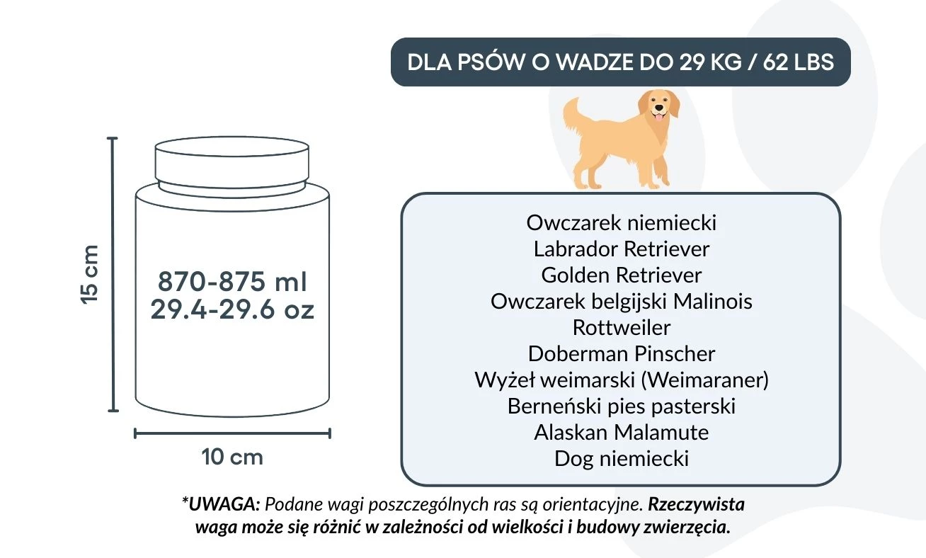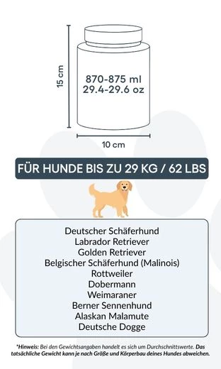 10 cm (B) × 15 cm (H) × 10 cm (L) | 870–875 ml / 29,4–29,6 oz – lämplig för hundar upp till ca 29 kg / 62 lbs