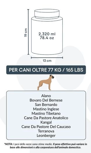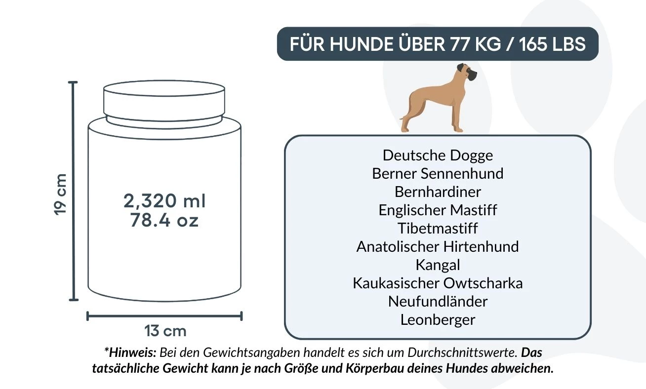 13 cm (B) × 19 cm (H) × 13 cm (L) | ~2 320 ml / 78,4 oz – lämplig för hundar upp till ca 77 kg / 165 lbs