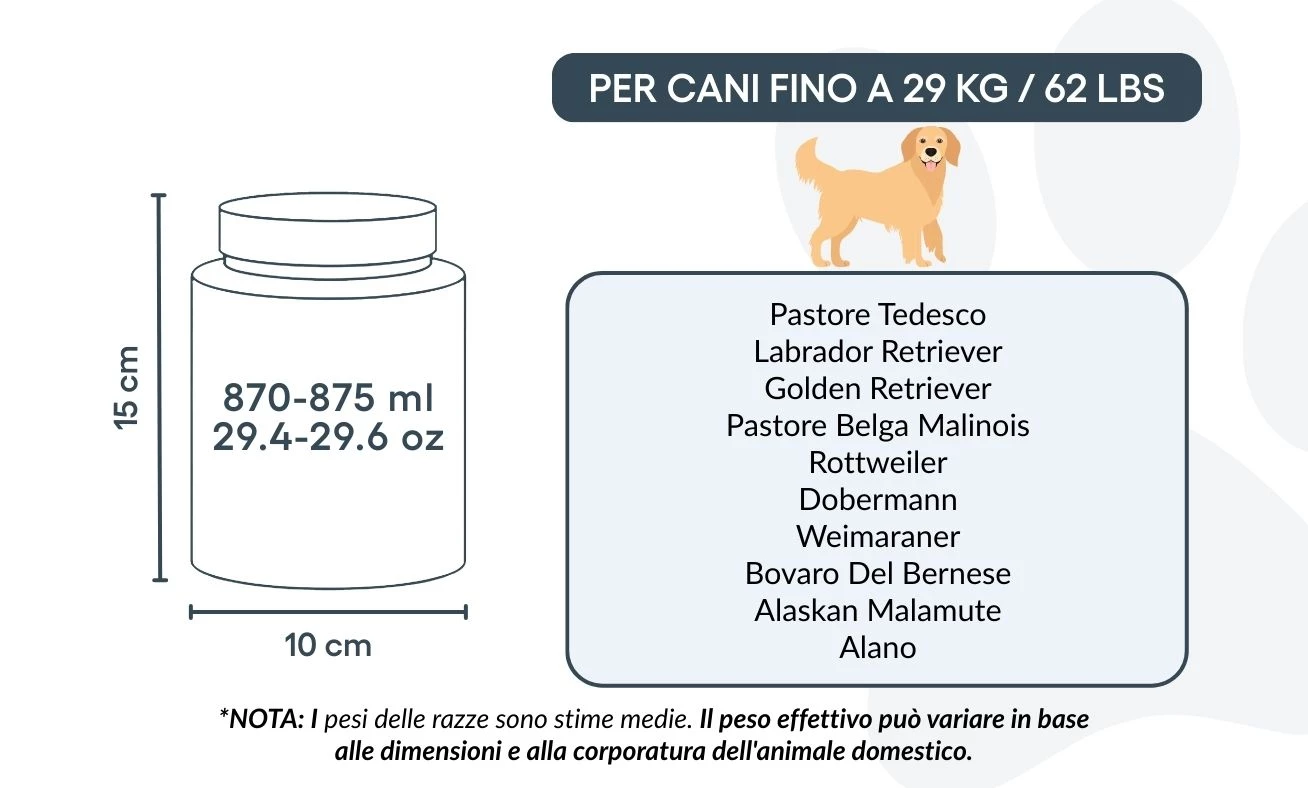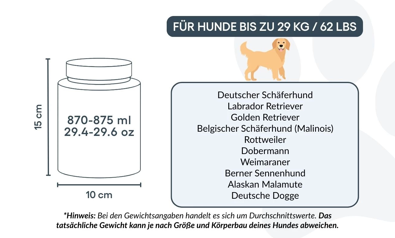 10 cm (B) × 15 cm (H) × 10 cm (L) | 870–875 ml / 29,4–29,6 oz – lämplig för hundar upp till ca 29 kg / 62 lbs