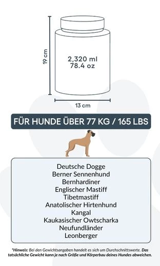 13 cm (B) × 19 cm (H) × 13 cm (L) | ~2 320 ml / 78,4 oz – lämplig för hundar upp till ca 77 kg / 165 lbs