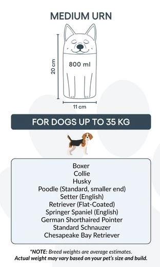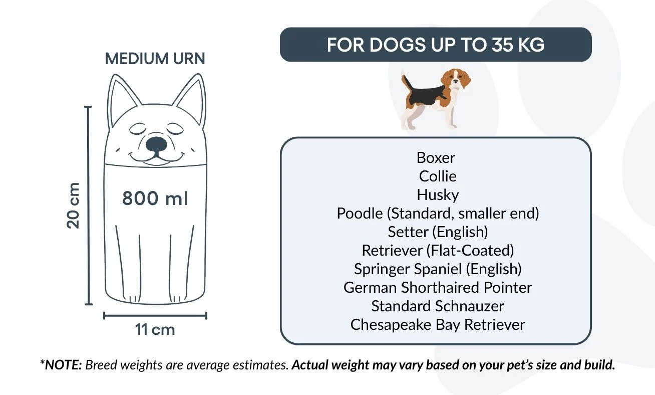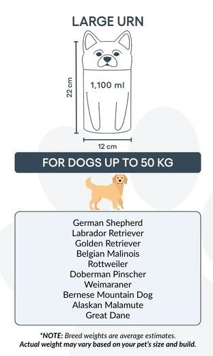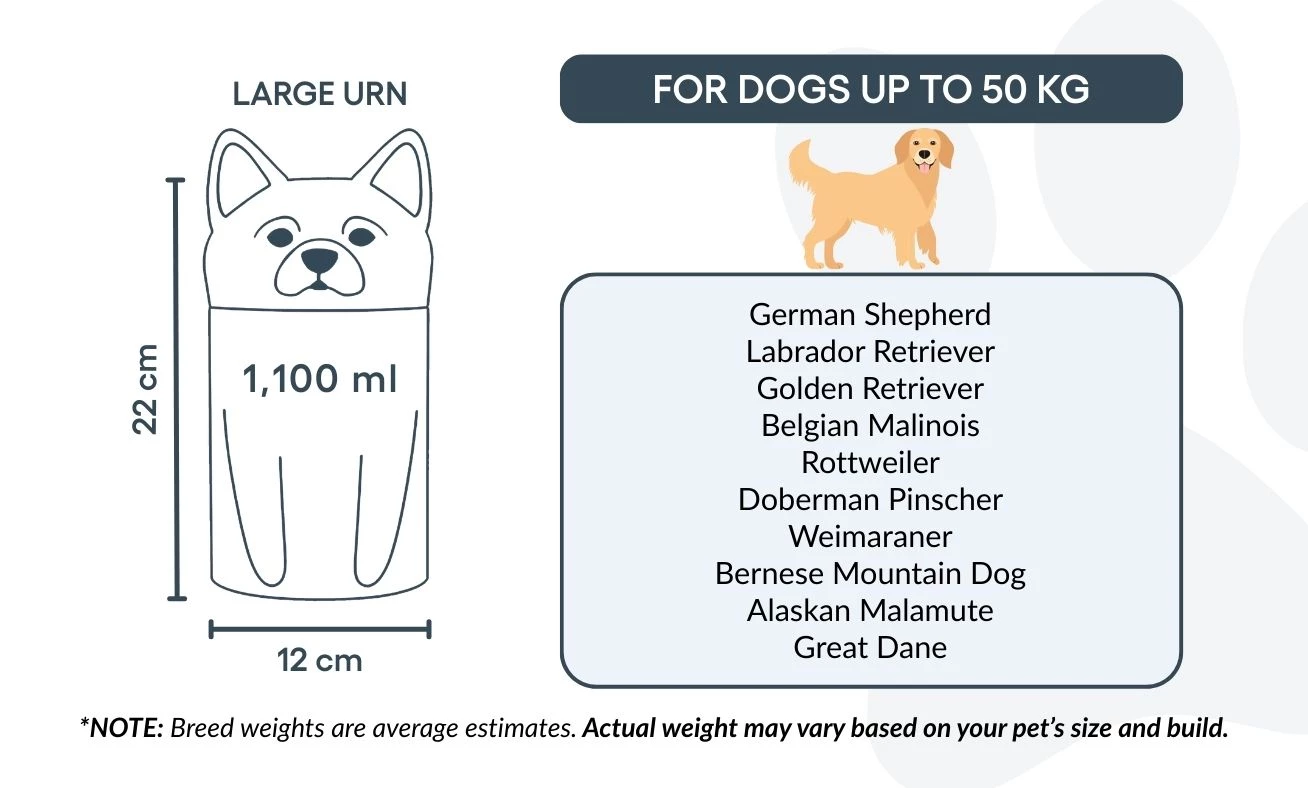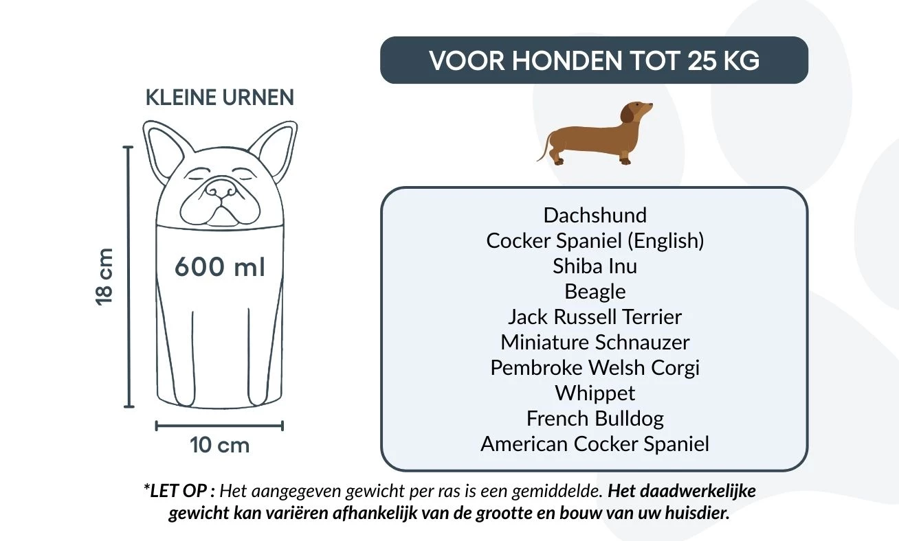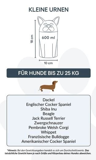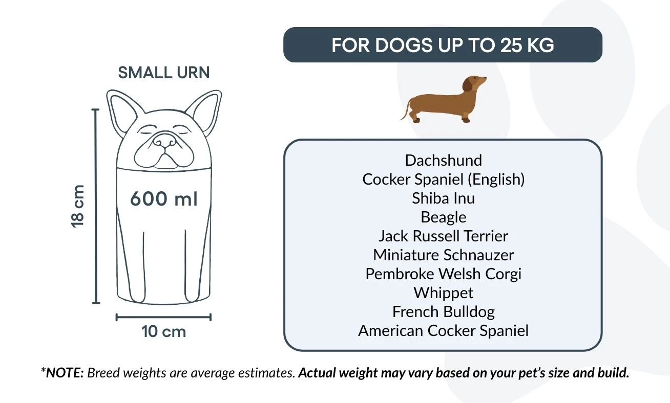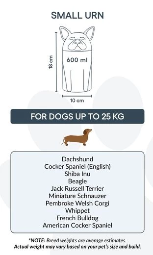 Obs: Volymuppskattningarna baseras på genomsnittliga resultat från husdjurskremering. Vänligen ta hänsyn till ditt husdjurs vikt och kroppsbyggnad vid val av urna.