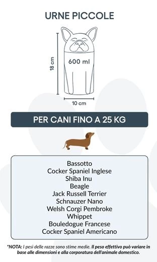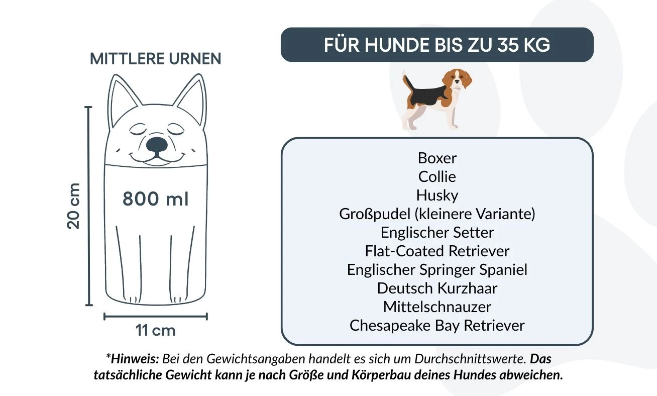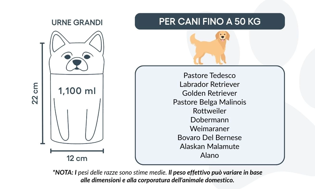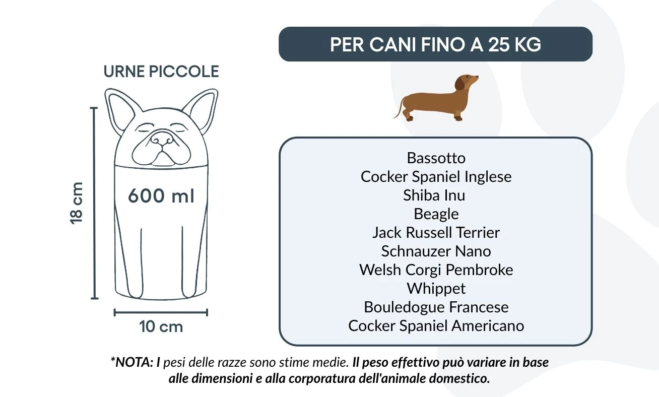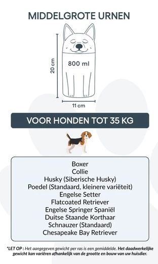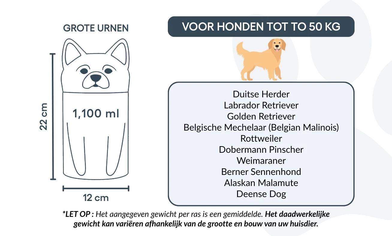 Obs: Volymuppskattningarna baseras på genomsnittliga resultat från husdjurskremering. Vänligen ta hänsyn till ditt husdjurs vikt och kroppsbyggnad vid val av urna.