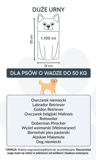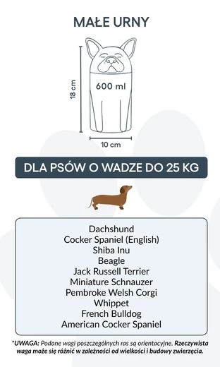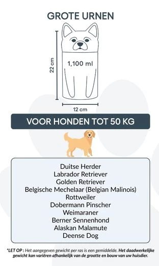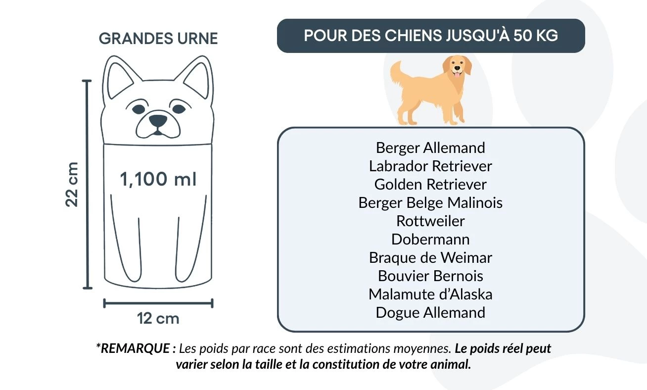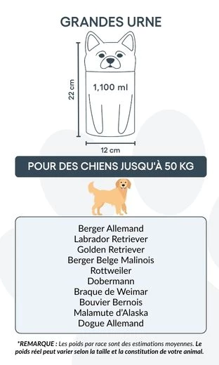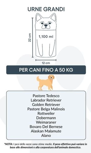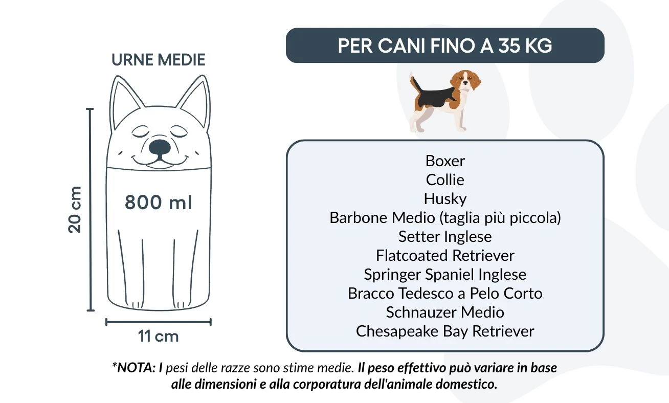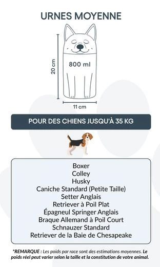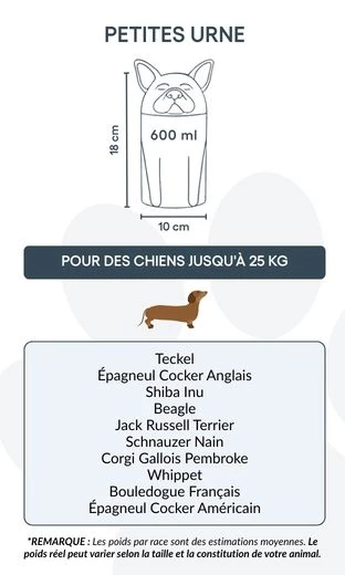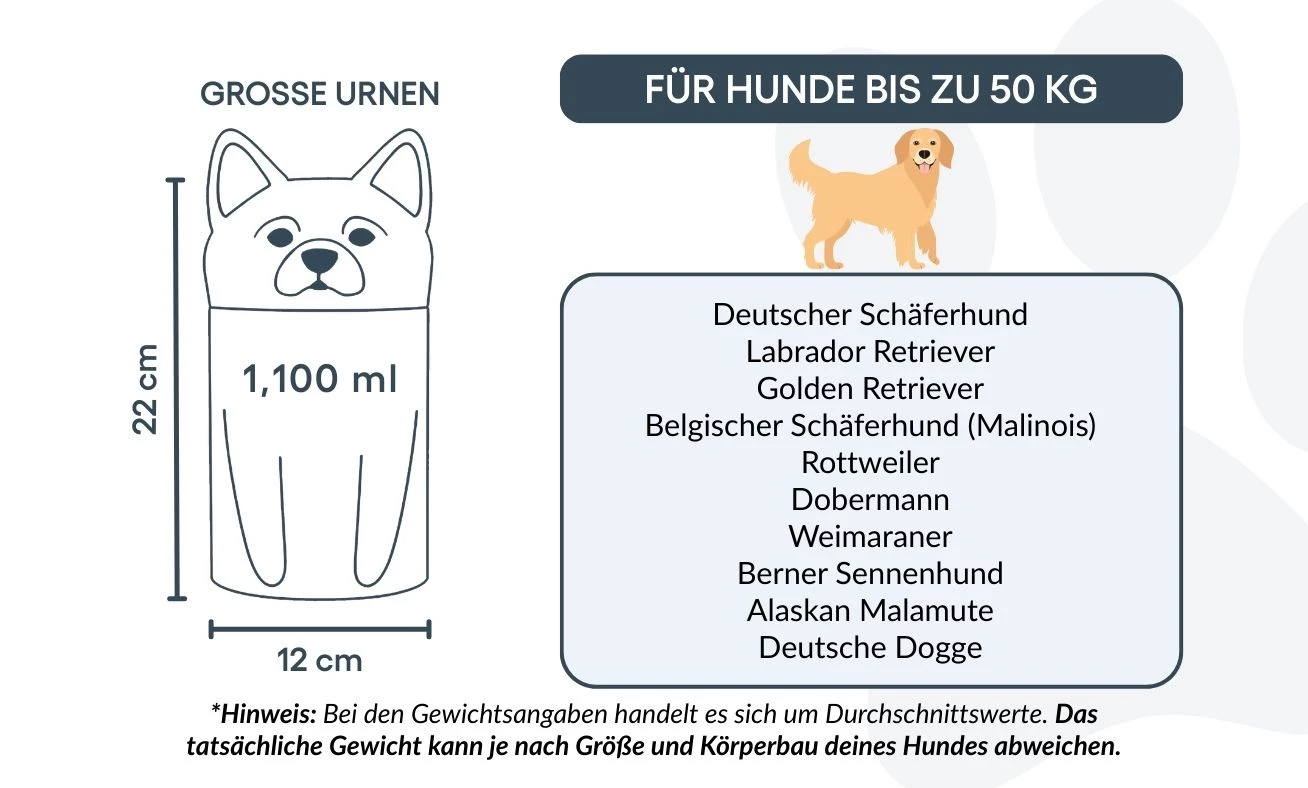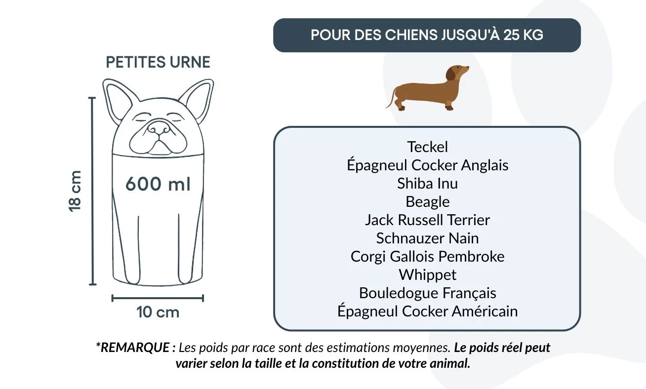 Obs: Volymuppskattningarna baseras på genomsnittliga resultat från husdjurskremering. Vänligen ta hänsyn till ditt husdjurs vikt och kroppsbyggnad vid val av urna.