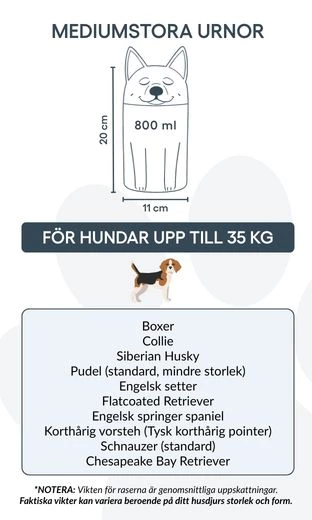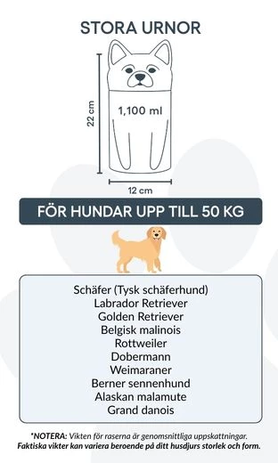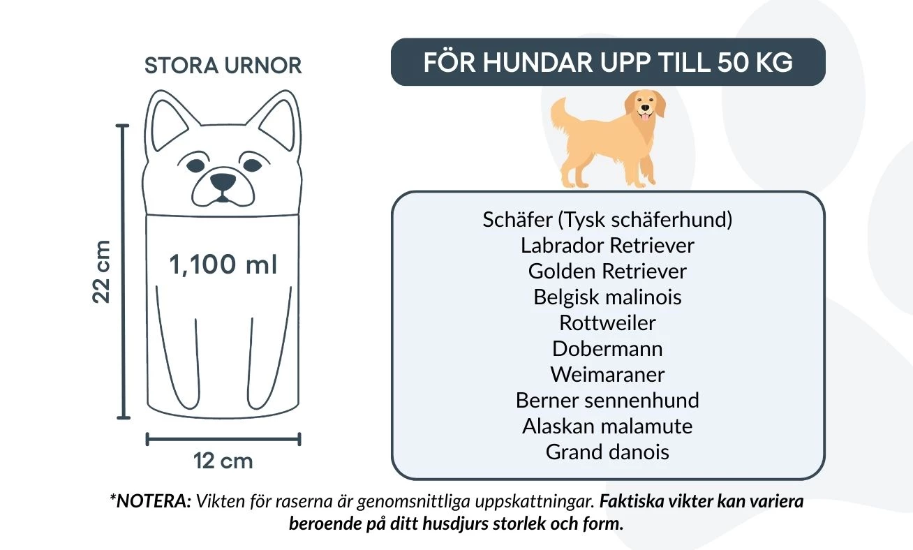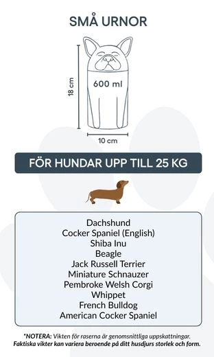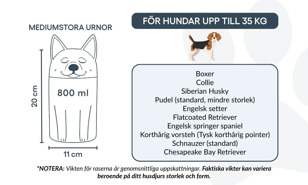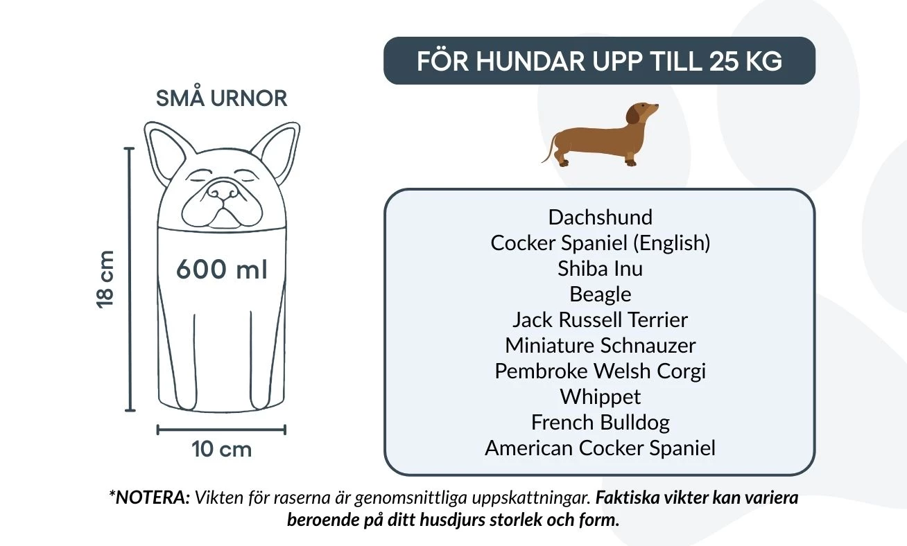 Denna hundurna finns i tre storlekar som passar olika raser och vikter, och kan personanpassas med hundens namn och en kort text. Oavsett om du minns en terrier, chihuahua eller collie, är denna unika keramiska urna ett värdigt och personligt minne som speglar din hunds individualitet.