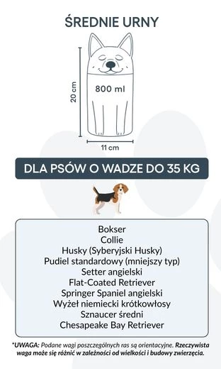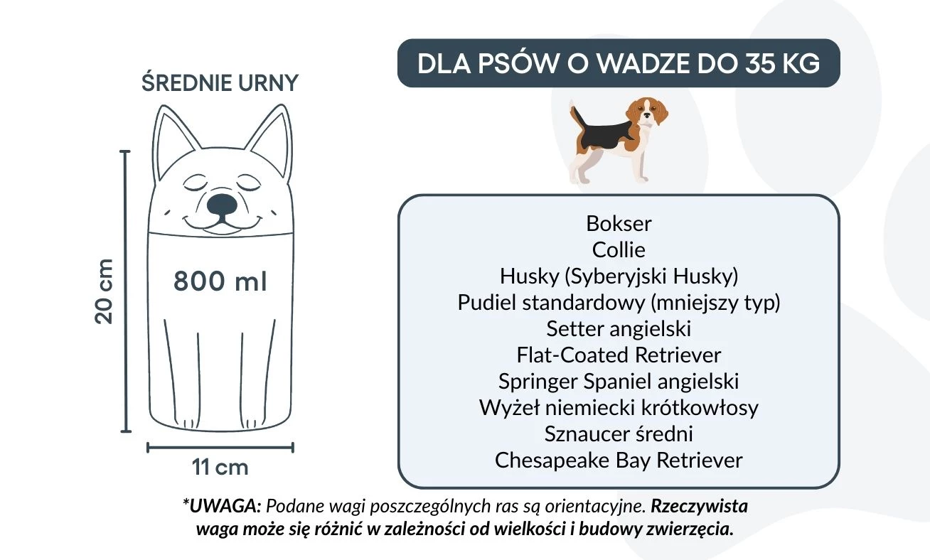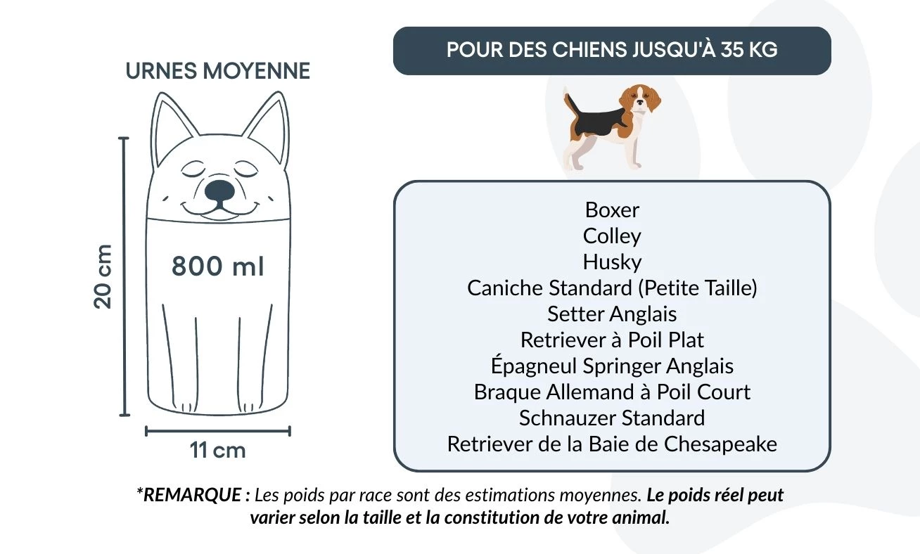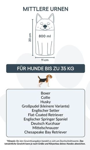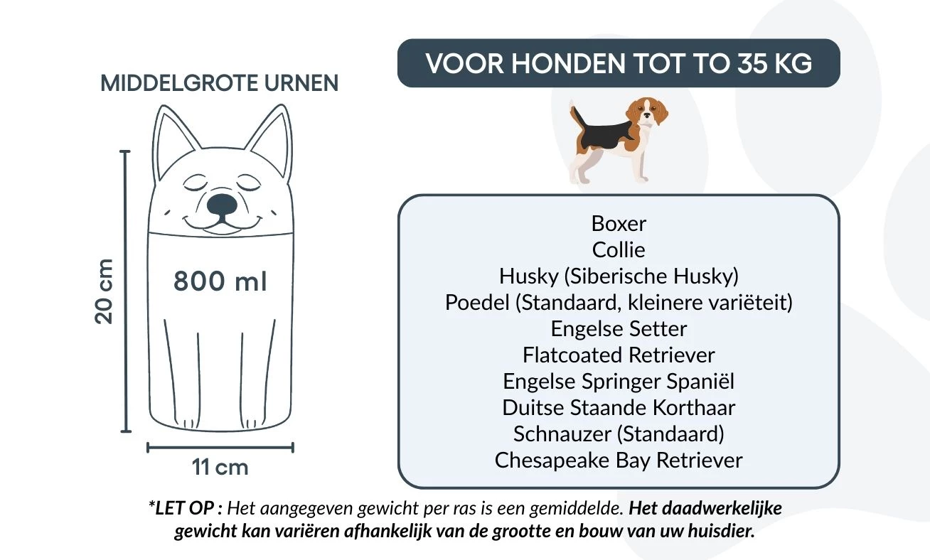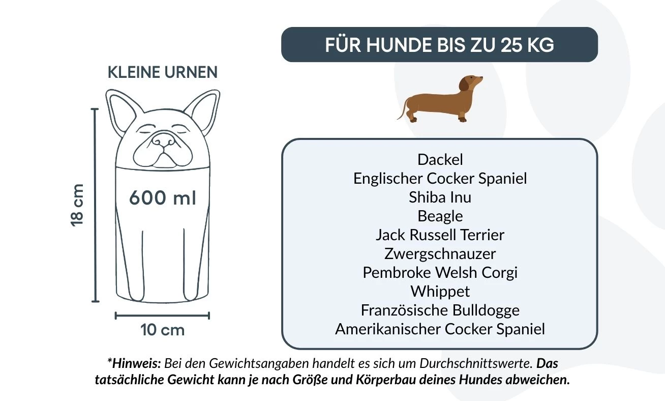 Denna hundurna finns i tre storlekar som passar olika raser och vikter, och kan personanpassas med hundens namn och en kort text. Oavsett om du minns en terrier, chihuahua eller collie, är denna unika keramiska urna ett värdigt och personligt minne som speglar din hunds individualitet.