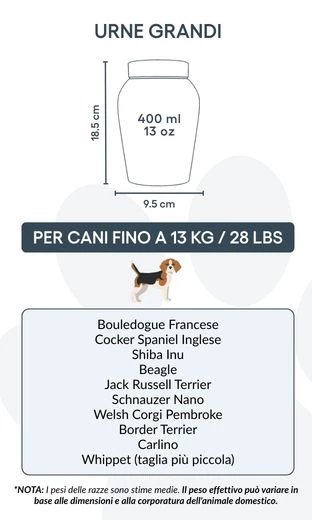 Skapa ett varaktigt minne av din älskade hund med denna Personliga Hundurna med Namn, Datum och Särskild Hyllning på Locket, omtänksamt utformad för att hedra minnet av din trogna vän med värdighet. Med ett hjärtligt budskap på locket och möjlighet att anpassa med namn och datum blir denna kremeringsurna ett djupt personligt minne av din fyrbenta följeslagare.