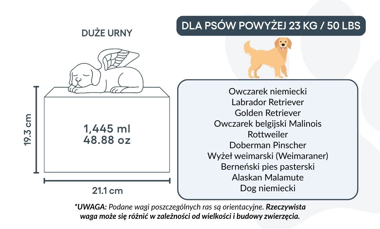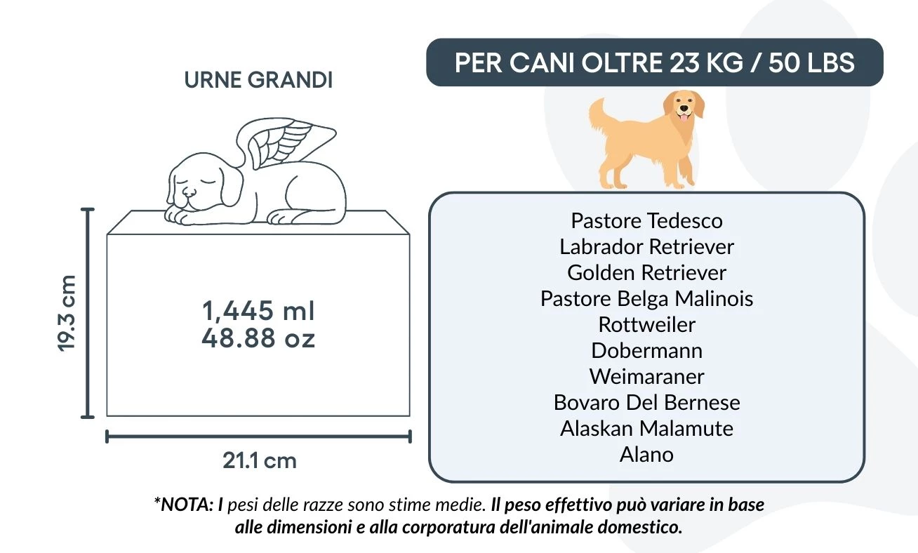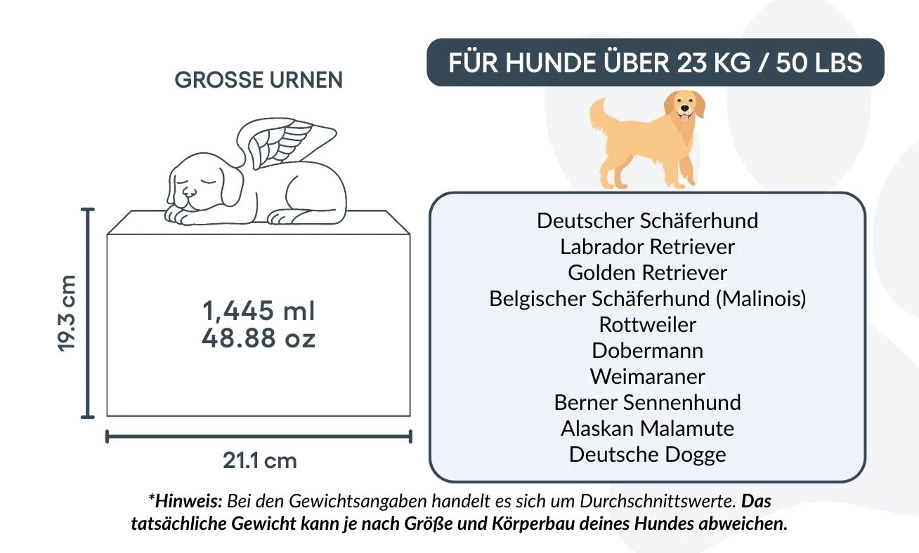 Med en generös kapacitet på cirka 1 445 ml passar denna träurna för mellan- till större hundar. Oavsett om du vill bevara askan efter en trogen följeslagare eller skapa en vacker plats för minne och stillhet, erbjuder denna urna ett tröstande och värdigt sätt att hålla dem nära.
