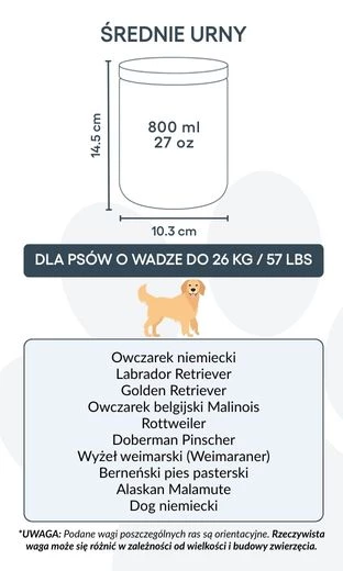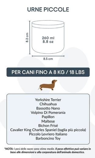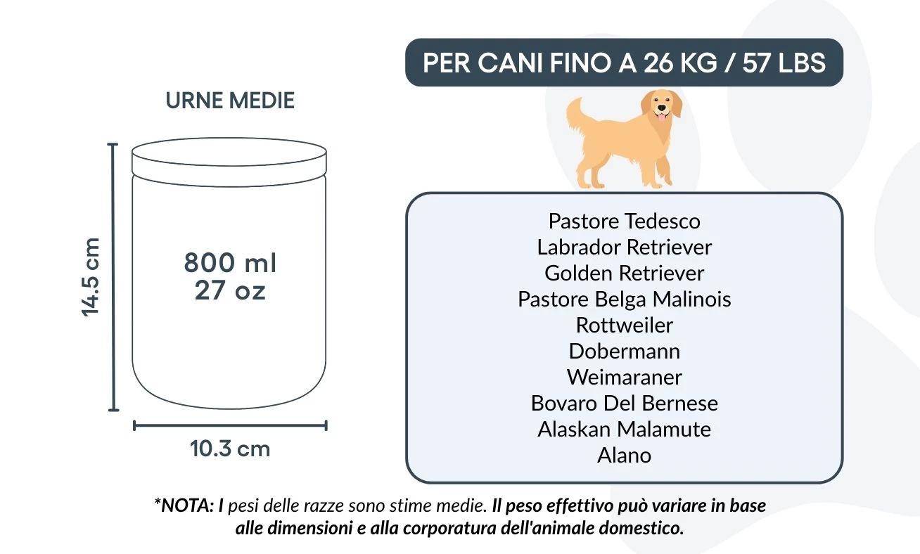 Perfekt för små till medelstora hundar, finns denna kremeringsurna i två storlekar för husdjur upp till 26 kg. Oavsett om den placeras på en hylla eller i ett stilla minnesutrymme, fungerar den som en enkel och hjärtlig påminnelse om bandet ni delade.