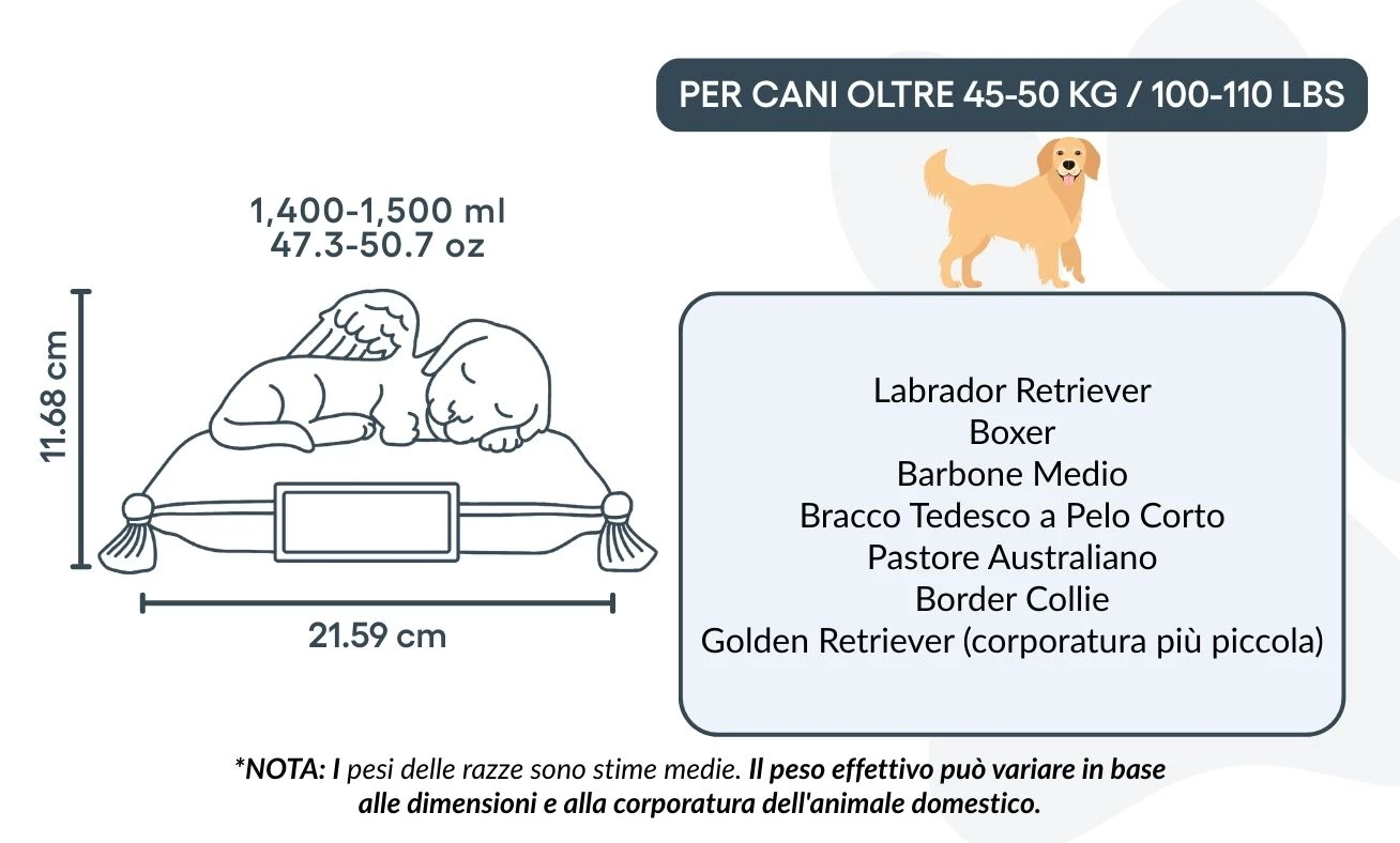 Observera: Volymuppskattningarna baseras på genomsnittlig mängd aska efter kremering. Tänk på ditt husdjurs vikt och kroppsbyggnad vid val av urna.